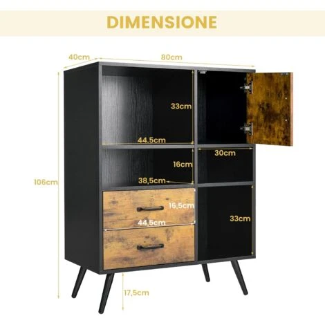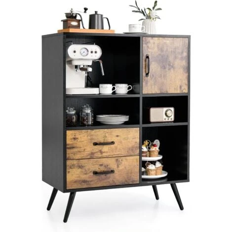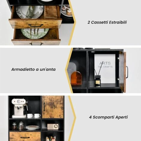 - Un’ampia Capacità di Contenimento: Il mobile buffet può servire come pratico organizzatore per tenere in ordine stoviglie, utensili, piccoli elettrodomestici e altri oggetti essenziali. Il piano d’appoggio è spazioso e dispone di 4 scomparti aperti per gli oggetti di uso frequente, mentre l’armadietto a un’anta e i 2 cassetti estraibili consentono di riporre oggetti antiestetici o privati.