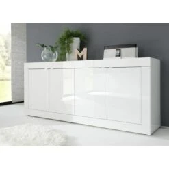 Realizzata in melaminico e con una finitura legno di alta qualità, questa madia dalla linea moderna e attuale viene proposta con una finitura in pregiato laccatura bianco lucido.