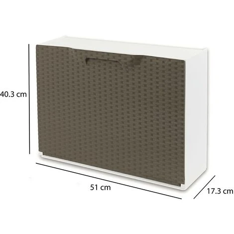 STRUTTURA E UTILIZZO – Scarpiera componibile con un’anta a ribalta finitura effetto rattan – La stuttura è formata da moduli incastrabili verticalmente, predisposti anche per il fissaggio laterale tra di loro e a parete – Apertura a ribalta salvaspazio – Prodotto perfetto da utilizzare sia all’interno che all’esterno, posizionabile dal garage, corridoio, ripostiglio oppure balcone.