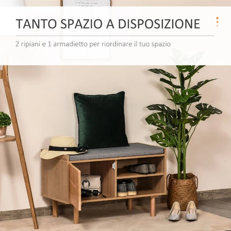 Dimenticati delle scarpe abbandonate in giro per casa, con il mobile scarpiera HOMCOM saranno sempre in ordine. Dotato di 2 vani che possono ospitare in totale fino a 4 paia di scarpe e un armadietto con anta, per tenere in ordine anche gli accessori che ti servono. Questa scarpiera in legno è dotata di una panca integrata con cuscino imbottito, per sederti comodamente quando devi cambiare le scarpe. Realizzata in solido truciolato e legno naturale, questa scarpiera bassa è resistente e durevole. Funzionale e decorativa, si adatta a ogni ambiente e arredo della tua casa.