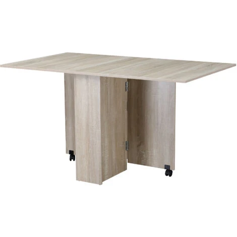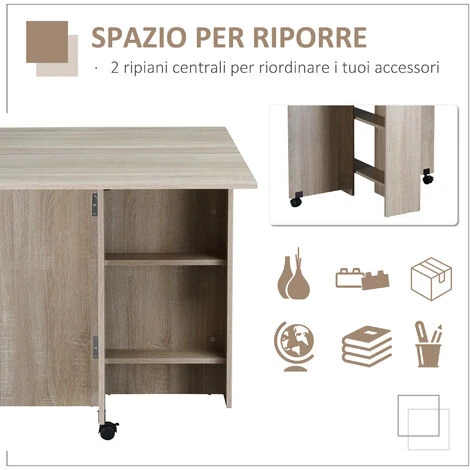 Questo tavolo pieghevole in legno può adattarsi a qualsiasi ambiente della tua casa. Quando è chiuso, il tavolo rettangolare ha l’aspetto di una consolle ma, una volta aperto, può ospitare fino a 4-6 presone. Sotto il piano d’appoggio sono presenti 2 pratici ripiani che offrono tanto spazio per riporre i tuoi oggetti. Le 2 ruote (di cui una con freno) permettono una maggiore mobilità: puoi infatti spostarlo ovunque e senza nessuna fatica.