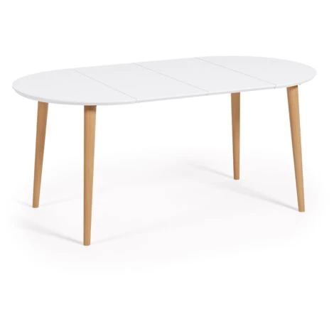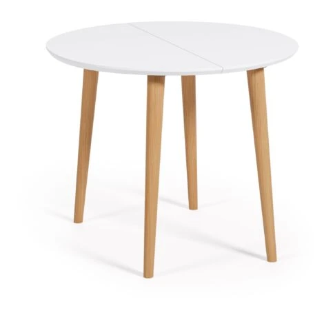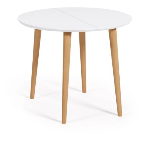 Tavolo rotondo allungabile Oqui MDF laccato bianco e gambe in faggio massiccio 90 (170) x