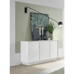 La madia è dotata di 3 ante in finitura bianco lucido, la ferramenta è in metallo.