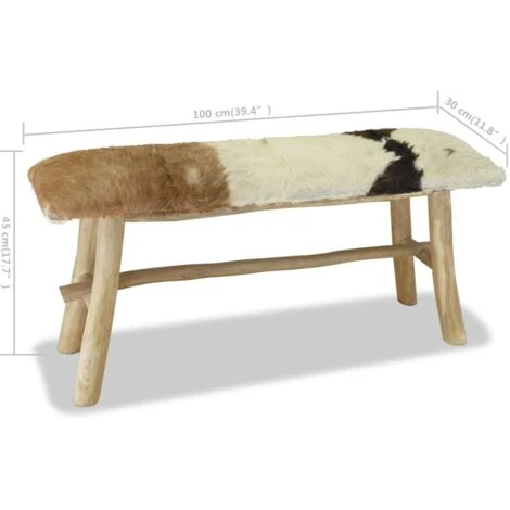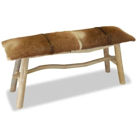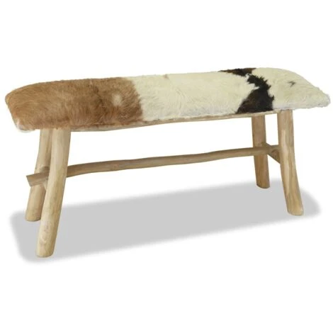 La panca ha una solida struttura in teak che la rende stabile e molto durevole. Il sedile è rivestito in vera pelle di capra al 100%, forte e resistente, con un motivo a pelle di mucca. La villosa pelle di capra è morbida al tatto ed estremamente comoda. Il bellissimo motivo in pelle naturale rende ognuno di questi pezzi unico e leggermente diverso da tutti gli altri. Grazie alla morbida imbottitura sul sedile potrete godervi il massimo comfort di seduta. Le gambe, nel colore naturale del legno, aggiungono un tocco di fascino rustico all’insieme.