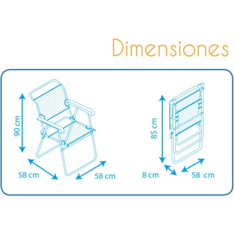 Questa sedia da spiaggia pieghevole blu è realizzata con un sistema di chiusura di sicurezza. Puoi portarla comodamente in spiaggia, occupa poco spazio. Struttura tubolare tonda leggera di alluminio antiossidabile che ne permette il suo uso in spiaggia o in piscina. In textilene, tessuto comodo e flessibile che consente la traspirazione e si asciuga rapidamente, indicata per gli esterni, sopporta le intemperie. Pieghevole, poco spazio di stoccaggio. Piedini stabilizzatori per una maggiore stabilità.nnCaratteristiche:n- Per 1 persona.n- Uso esterno.n- Struttura tubolare alluminio.n- Misure: 58x58x90 cm.n- Materiale: tessuto textilene.n- Lavabile con acqua.n- Colore: blu.n- Peso massimo consentito: 100 kg.n- Peso: 1,7 kg.