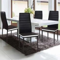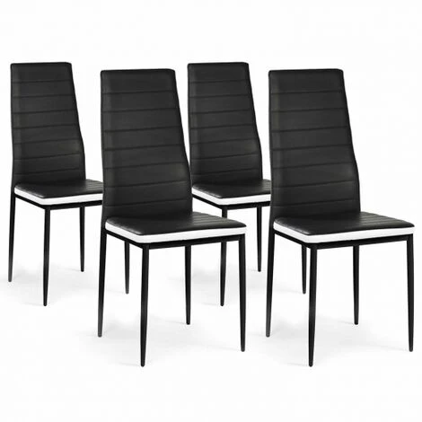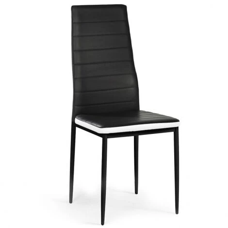 Farà un figurone in salotto o in cucina.Questo set di 4 sedie nere sarà perfetto per il vostro salotto o per la vostra cucina.Garantiscono una seduta confortevole grazie all’imbottitura e allo schienale alto. Godetevi un momento piacevole a tavola con la famiglia e gli amici.Se siete alla ricerca di sedie di design economiche in nero con strisce bianche, abbiamo il set di sedie giusto per voi a un prezzo imbattibile. Potete anche scoprire le sedie ROMANE.Se siete amanti di questo colore, potete anche scoprire le sedie ROMANE X6 completamente nere.Rivestimento in PVC per una facile pulizia e struttura in metallo verniciato nero.Dimensioni delle sedie ROMANE nereDimensioni totali: lunghezza 48 x larghezza 42 x altezza 97 cmVenduto in confezioni da 4 sedieQuesta sedia è disponibile anche in bianco e nero:- Set di 6 sedie da pranzo nere – Set di 6 sedie da pranzo nere – Set di 6 sedie da pranzo grigie – Set di 6 sedie da pranzo grigie – Set di 6 sedie da pranzo bianche