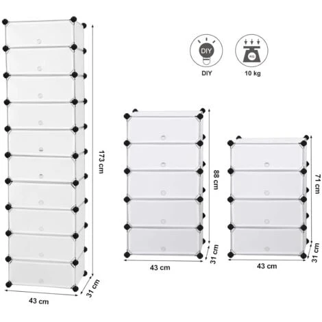 Questo guardaroba/scarpiera modulare di Songmics si tratta di un prodotto innovato per voi. Ha l’aspetto elegante, grazioso e di stile semplice. Offrendo sufficiente spazio per organizzare gli oggetti disordinati, è anche di buon rapporto qualità. I pannelli in plastica PP, giunti in ABS e cornici di fili in ferro, gli elementi garantiscono la durata e stabilità. I pannelli degli scompartimenti sono traslucidi in modo da poter facilmente trovare ciò che si trovate. Inoltre, è leggero e senza ingombro, con le istruzioni chiare per montaggio. Sarà un ruolo indispensabile nella vita di tutti i giorni.