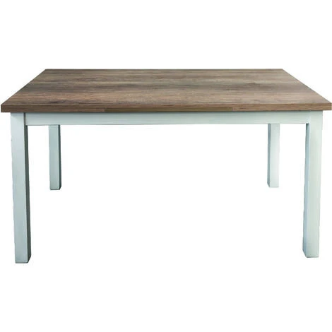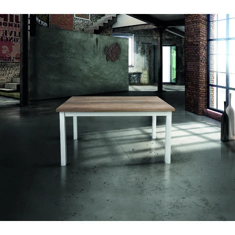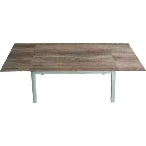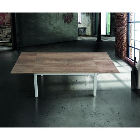 Tavolo allungabile in legno nobilitato con rifinitura bicolore piano in rovere naturale e gambe laccate bianche.