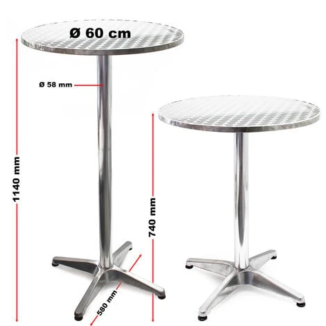 | Dimensioni | Altezza: 74 o 114 cm Piano per tavolo: Ø 60 cm Diametro tubo: Ø 58 mm Piedistallo: 580 mm |